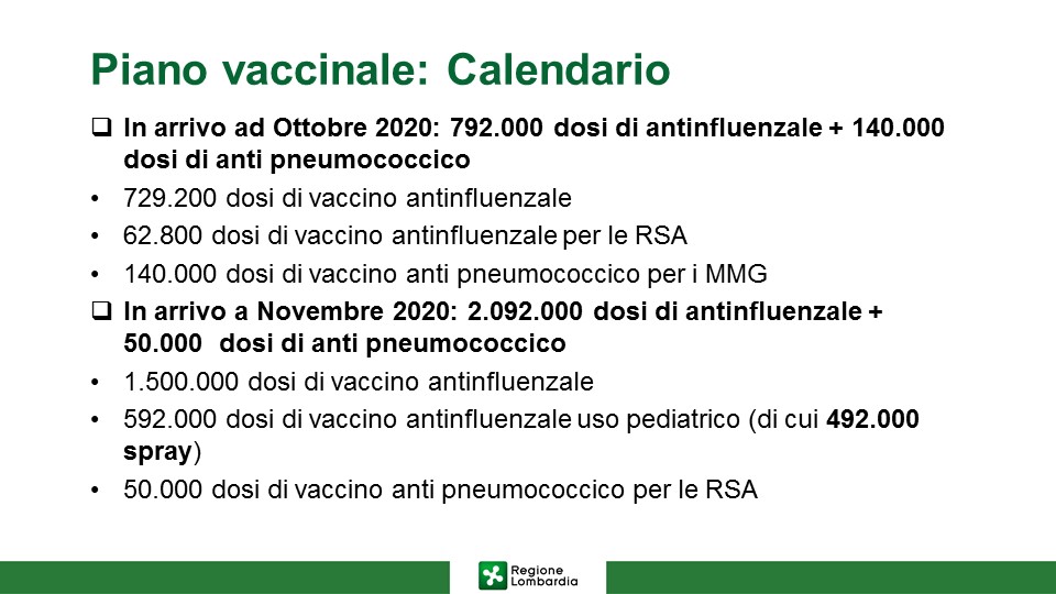 Questo, in sintesi, il piano della campagna vaccinale per la stagione 2020/21 presentata dal direttore generale dell’assessorato regionale al Welfare, Marco Trivelli e dal virologo, Fabrizio Pregliasco. Un piano che sarà accompagnato da una campagna di comunicazione che Regione Lombardia diffonderà attraverso tutti i suoi canali, coinvolgendo direttamente anche medici di medicina generale, pediatri, Comuni, farmacie, ATS, ASST, Trenord e FNM.