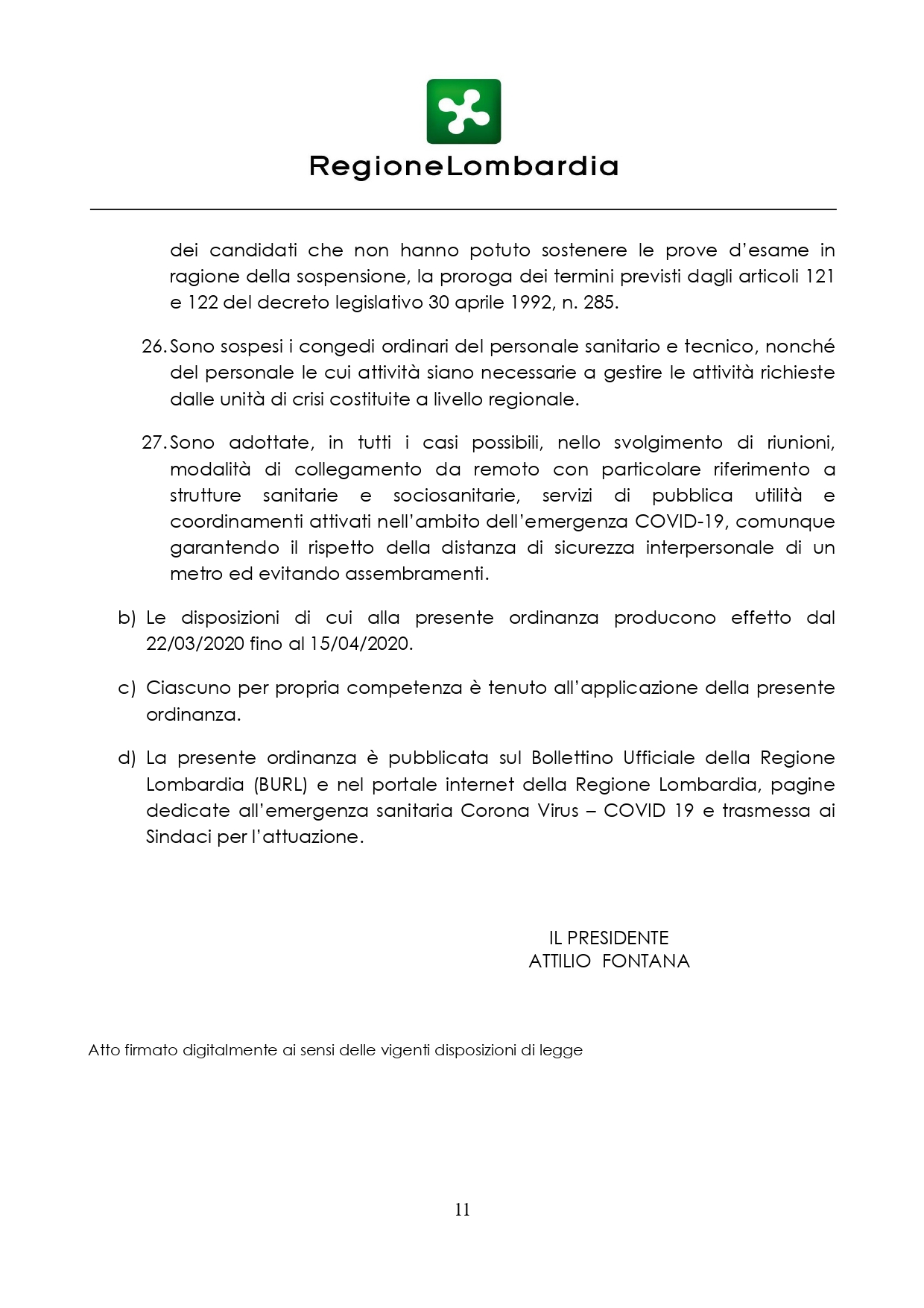 Lo comunica il presidente, Attilio Fontana, dopo il confronto avuto oggi in videoconferenza con i sindaci dei capoluoghi della Lombardia, il presidente dell’Anci Lombardia e dell’UPL e i rappresentanti del Tavolo del Patto per lo Sviluppo. L’ordinanza entra in vigore domenica 22 marzo e produce effetto – salvo diverse disposizioni legate all’evoluzione della situazione epidemiologica – fino al 15 aprile.