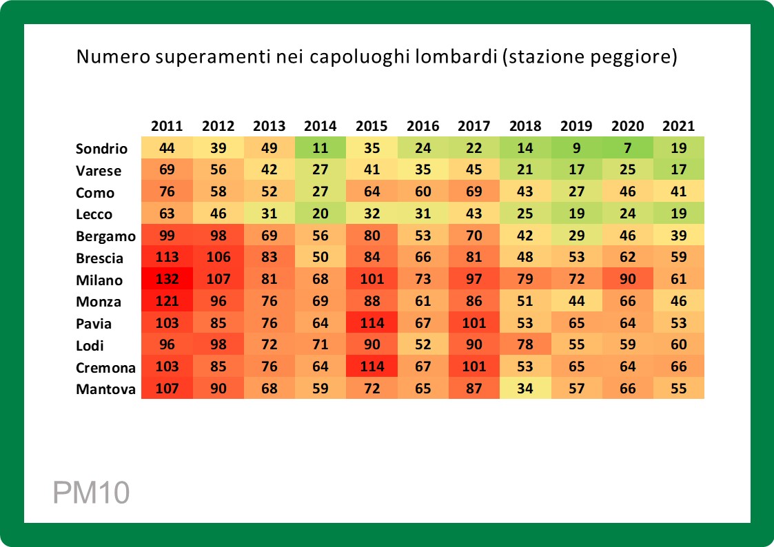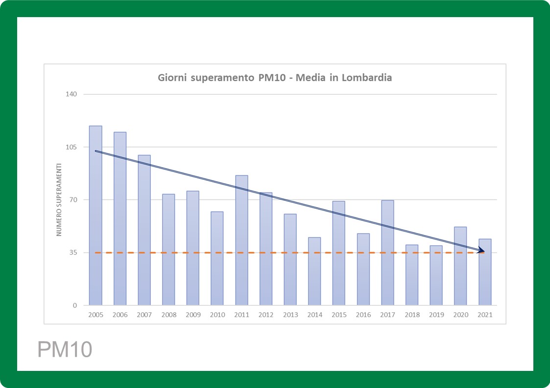 Si conferma un trend in generale diminuzione per il PM10, con valori che in diverse città risultano migliori o uguali al dato più basso mai registrato. A Monza, Brescia, Cremona, Pavia, Lecco, Varese. Anche il numero di giorni di superamento del valore limite giornaliero di PM10 (50 µg/m³), ha confermato il trend complessivamente in diminuzione registrato per la media annua, con un marcato miglioramento rispetto al 2020. Benché in buona parte della regione ancora sopra al limite che la normativa fissa in 35 giorni.